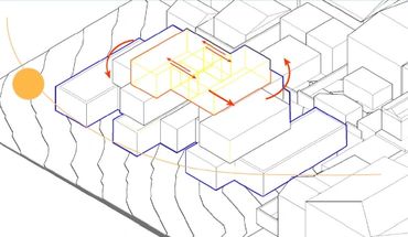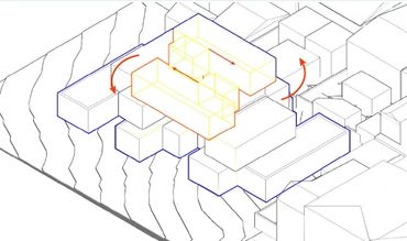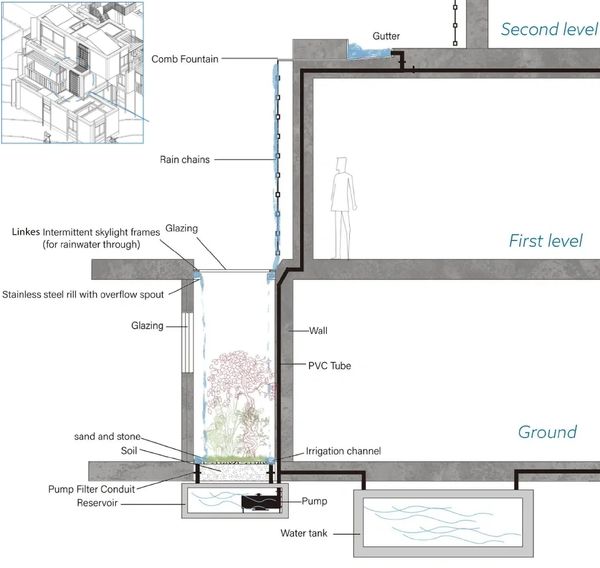 There are three floors in total, and the legs and feet of the elderly are not convenient to be placed on the ground floor. All the ways to enter the household of dewlling are through the pavilion in the atrium. The middle staircase leads to the top floor